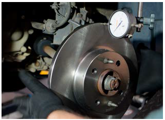 26. Montar o relógio comparador para realizar a medida do disco. É preciso colocar sempre a ponta seca no limite da borda do disco. Esse procedimento é feito para saber se há algum problema de usinagem no disco.