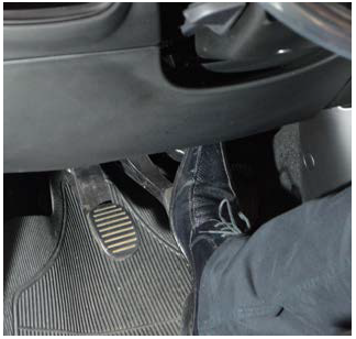 2. Ligar o veículo sem acelerar até estabilizar a marcha lenta. Com isso, o pedal de freio tende a descer, o que possibilita fazer o teste de curso de pedal. Basta segurar o pedal do freio como se estivesse dirigindo. Depois de fazer isso, desligar o motor para parar de gerar o vácuo na câmara do servo freio. Se estiver tudo em ordem o pedal não se moverá. Caso haja algum vazamento a tendência é o pedal se mover.