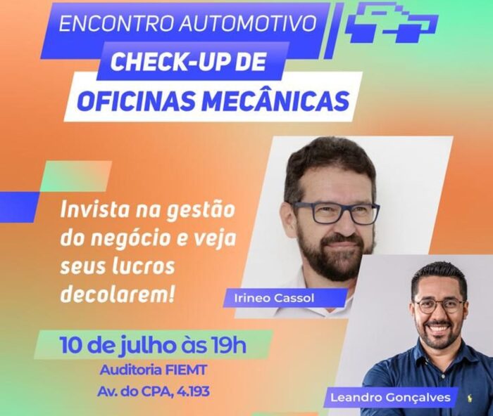 O Sindicato das Indústrias de Reparação Automotiva (Sindirepa/MT) em parceria com o Serviço Brasileiro de Apoio às Micro e Pequenas Empresas (Sebrae) realizam o encontro automotivo ‘Check-up de oficinas mecânicas’, que ocorrerá no dia 10 de julho, às 19h no auditório da Federação das Indústrias de Mato Grosso (Fiemt) em Cuiabá.