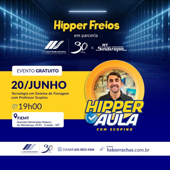 Hipper Freios, em parceria com W30, HS Distribuidora Borrachas e Autopeças e Sindirepa, convida você para uma aula exclusiva sobre Tecnologia em Sistema de Frenagem com o renomado Professor Scopino!